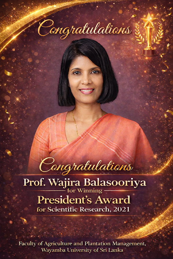 Congratulations, Prof. Wajira Balasooriya, our academic member from the Department of Biotechnology in the Faculty of Agriculture and Plantation Management, Wayamba University of Sri Lanka, won the President’s Award for Scientific Research in 2021 at the recent awarding ceremony held by the National Research Council, Ministry of Science and Technology. Well done, Professor! The faculty is proud of you.