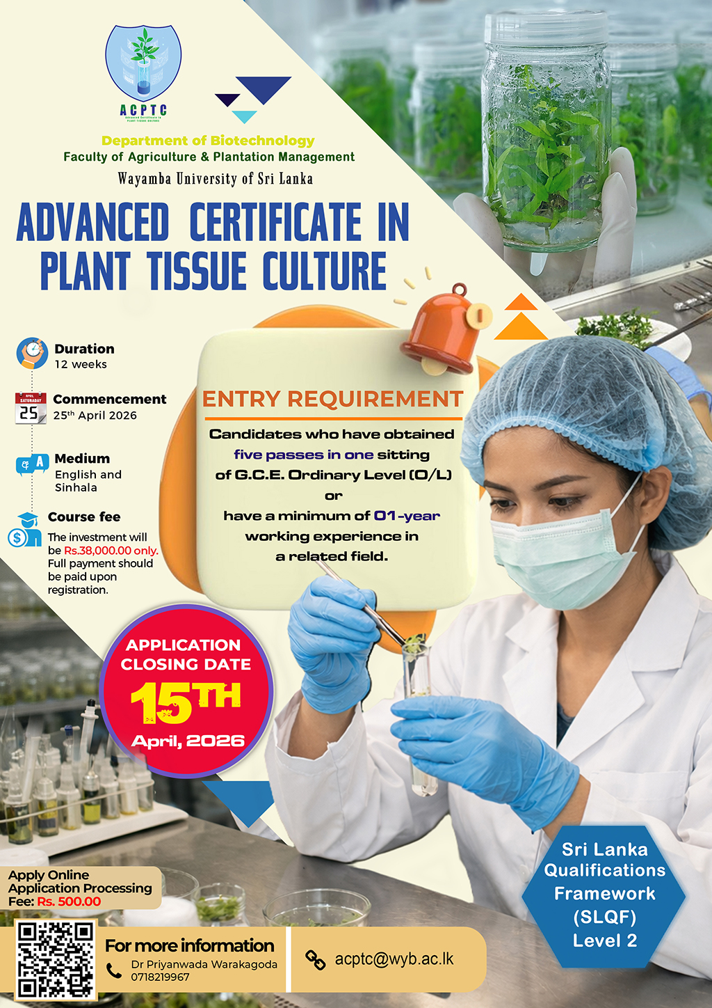 Advanced Certificate in Plant Tissue Culture – Fourth Intake Mar 16, 2026 Read More... Click Here to Apply Online